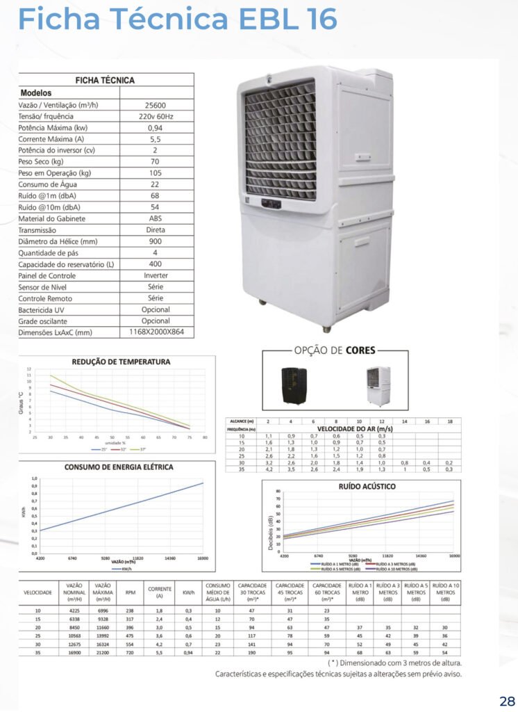 O climatizador EBL 16 é capaz de reduzir em até 12 graus a temperatura de espaços de até 176 m², tudo de forma portátil, econômica e comprometida com o meio ambiente.